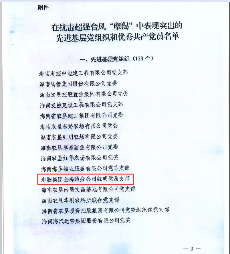 海南橡膠多個基層黨組織和黨員榮獲海墾集團抗擊超強臺風“摩羯”中表現(xiàn)突出的先進基層黨組織和優(yōu)秀共產(chǎn)黨員榮譽稱號